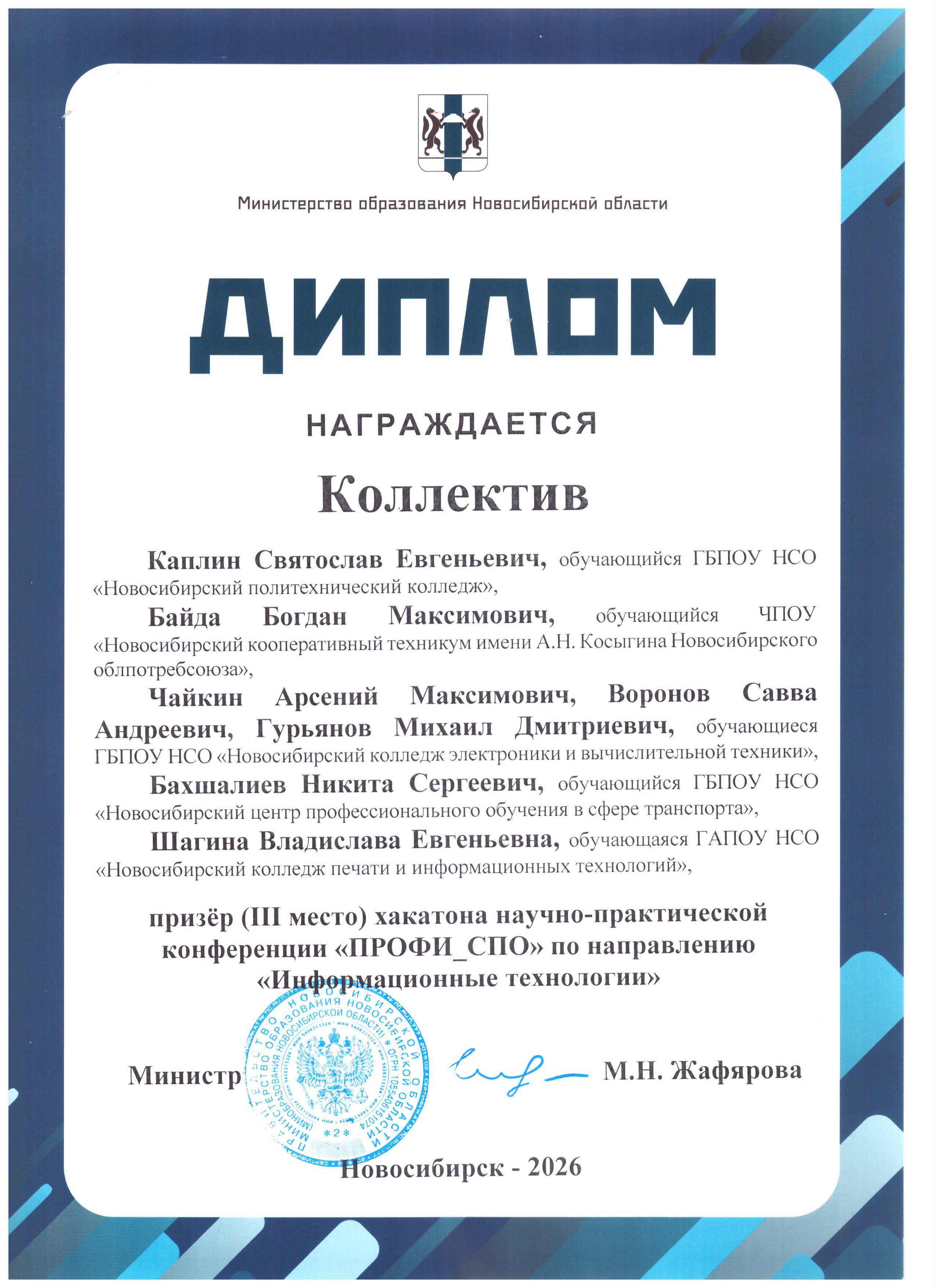 Диплом Призёра (3 место) хакатона научно-практической конференции "ПРОФИ_СПО" по направлению "Информационные технологии"