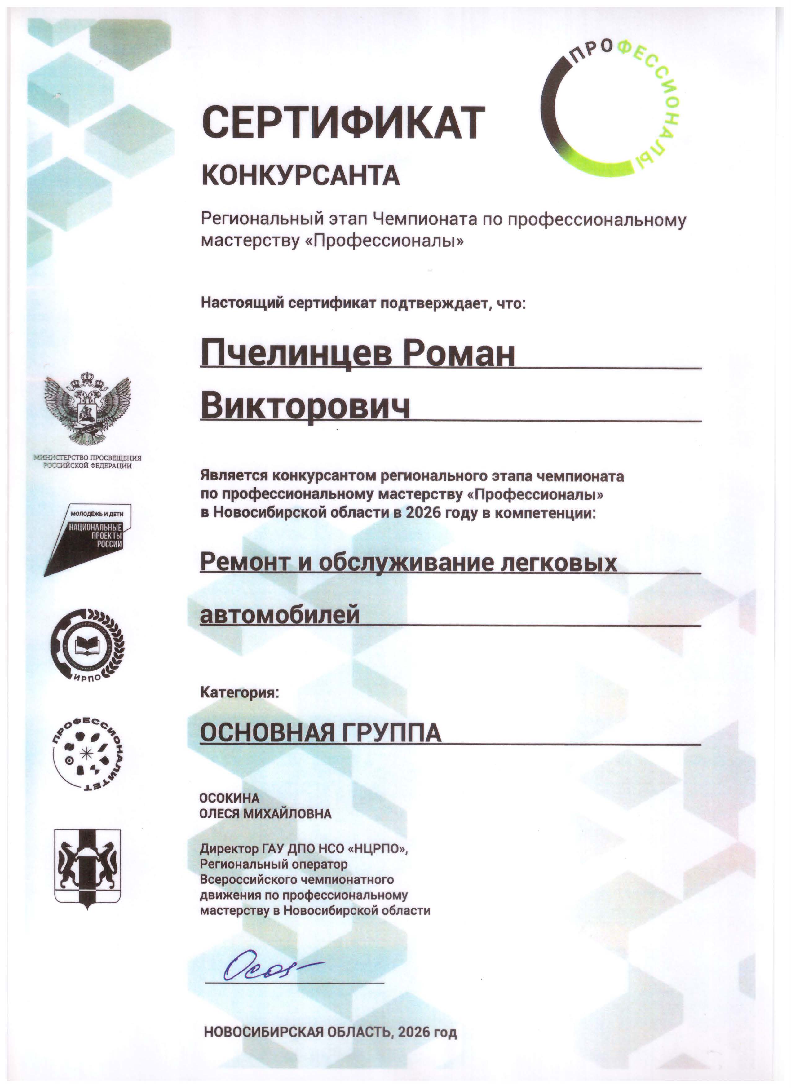 Сертификат конкурсанта регионального этапа Чемпионата по Профессиональному мастерству " Профессионалы" Пчелинцев Р.В.