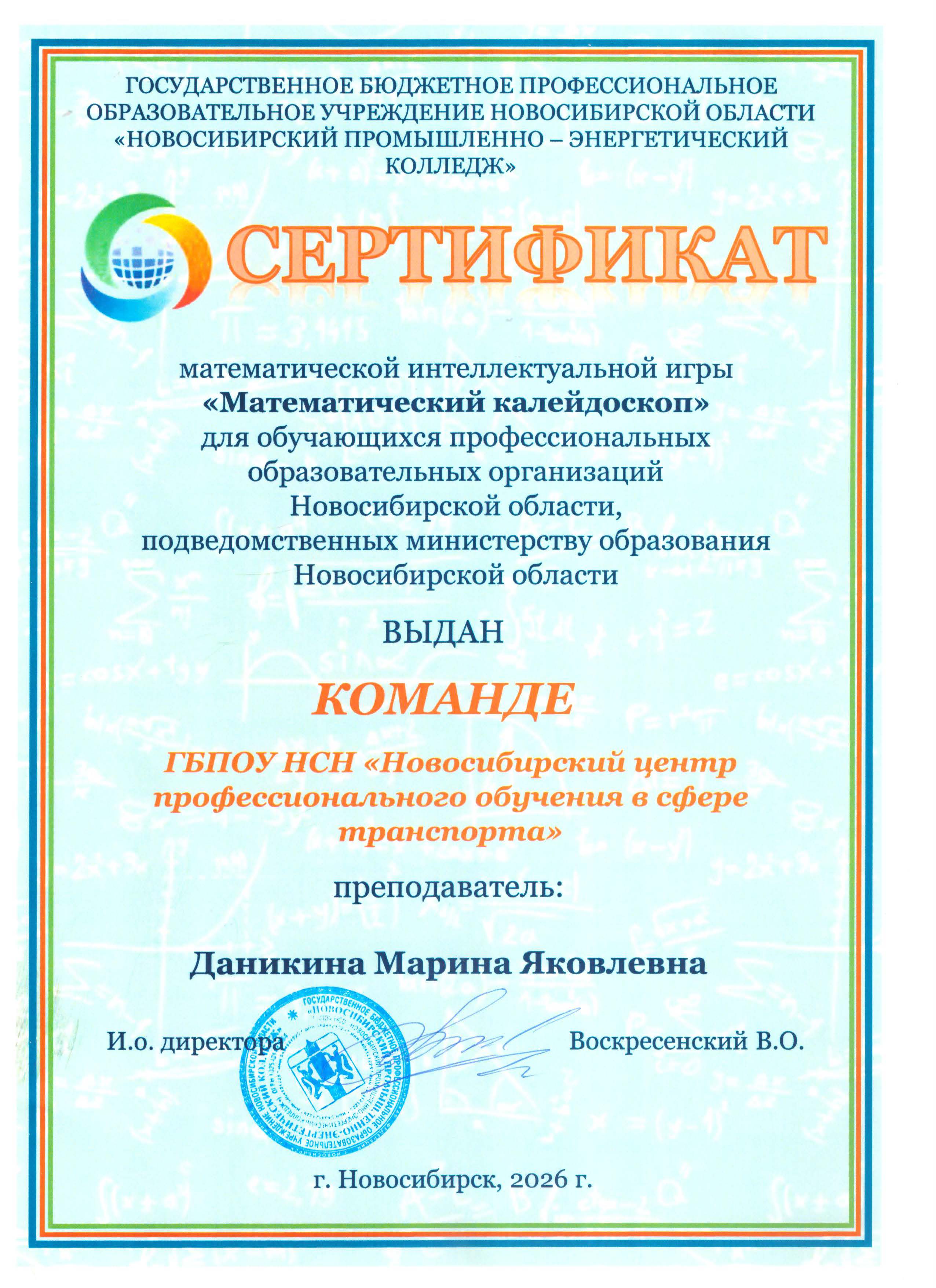 Сертификат об участие в математической интеллектуальной игре "Математический калейдоскоп"